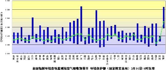 环境保护部(国家核安全局)有关负责人今日介绍说,环境保护部(国家核安全局)3月16日16时继续发布全国省会城市和部分地级市辐射环境自动监测站实时连续空气吸收剂量率监测值。监测结果汇总图中绿色曲线代表监测值,蓝色柱体代表天然本底水平,绿色曲线均在蓝色柱体范围内。监测结果表明我国辐射环境水平未受到日本核电事故的影响。
