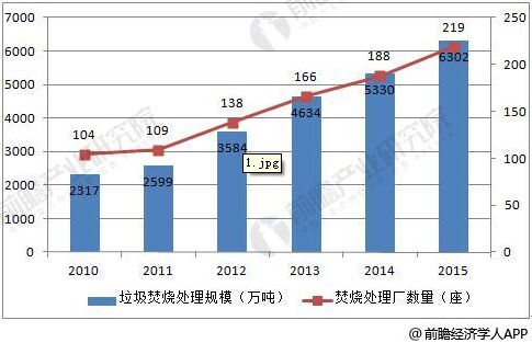 2010-2015年中国城市生活垃圾焚烧处理统计情况