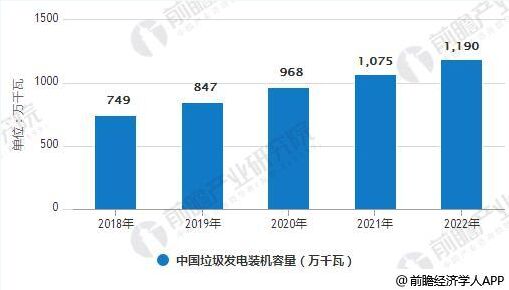 中国垃圾发电装机容量分析预测 2015年中国垃圾发电装机容量为530万千瓦。预计2018年中国垃圾发电装机容量将达到749万千瓦,未来五年(2018-2022)年均复合增长率约为12.27%,预计到2022年中国垃圾发电装机容量将达到1190万千瓦。