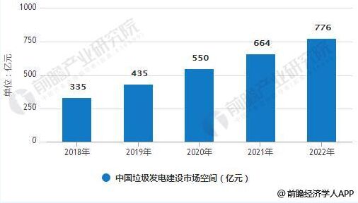 垃圾发电建设市场空间预测 预计2018年中国垃圾发电建设市场空间将达到335亿元,未来五年(2018-2022)年均复合增长率约为23.37%,预测到了2022年中国垃圾发电建设市场空间将达到776亿元。