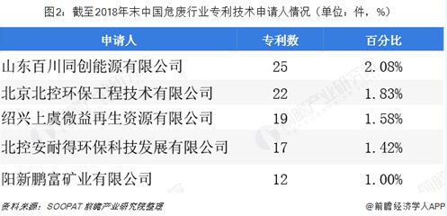 从专利申请人的角度来看,截至2018年末,我国危废行业专利技术申请量最多的是山东百川同创能源有限公司,专利数量达28件,占比达2.08%;其次是北京北控环保工程技术有限公司,专利数量达22件,占比达1.83%;排名第三、四、五的分别是绍兴上虞微益再生资源有限公司、北控安耐得环保科技发展有限公司、阳新鹏矿业有限公司,专利申请量分别达19件、17件、12件。