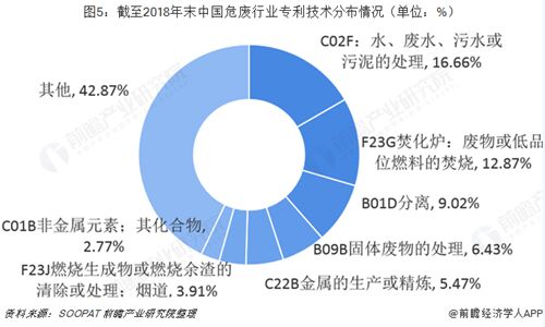 废水污泥处理成危废行业技术创新方向 从专利分布情况来看,目前,废水污泥处理成危废行业的一个主要技术创新方向。截至2018年末,废水、污泥处理的专利数量最多,占比达16.66%;其次是废物、燃料的焚烧,专利数量占比达12.87%;排名第三的是分离技术,占比达9.02%。