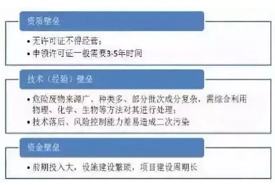 危险废物来源广泛,种类繁多,部分批次成分复杂,企业需根据所接收危废的成分不同选择不同的预处理方法,综合利用物理、化学、生物方法对污染物进行处理。处置企业设备效率低下、运作不稳定或风险控制经验不足都可能造成二次污染。 危废处置的前期投入成本较高,设施建设较为繁琐,项目从申请到投产运营一般需要三至五年的时间。根据弗若斯特沙利文的资料,总容量为300000吨的填埋处置设施通常需要约人民币1亿元的初步投资,对企业资金实力和融资能力要求较高。 危废行业主要壁垒