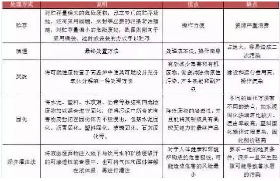 无害化处置需求高,焚烧或成未来主流: 危险废物处置分为资源化和无害化两种。其中资源化业务前期固定资产投入相对较少,利润率较高,对企业融资能力要求较低,适合新进入行业的中小企业。事实上从事该种处置业务的企业较多,规模往往较小,是目前危废行业民企的主要处置方式。 主要的危险废物最终处置方式比较: 无害化处置包括物化、贮存、焚烧、填埋、固化、深井灌注法、海洋倾倒法、远洋焚烧法、土地耕作法等多种方法。 现阶段我国主要采用焚烧和安全填埋两种技术手段对危险废物进行最终处置。相对资源化处置,这两种方式都有较高的专业技术要求和环保要求,前期投入较高,投资回收期较长,较难吸引社会资本投资,主要由政府投资建设,是目前较为紧缺的处置方式。随着危废管理政策趋严,未来无害化处置的需求将进一步提高,而掌握焚烧设施和填埋场的企业将在未来的行业竞争中占据显著优势。