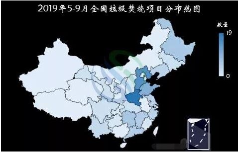2019年已进入金秋10月,近几个月的垃圾焚烧市场又有何发展态势?在此,根据已披露的公开信息,中国固废网不完全统计了2019年5-9月份的垃圾焚烧项目,数据显示,截至9月30日,2019年5-9月份,我国处在招标(启动资格预审)、发布资格预审结果、预中标和中标的垃圾焚烧项目达93个,总投资约522亿,垃圾焚烧处理规模逾10.5万吨/日,强劲延续了以往火热的发展态势。 注:以上数据由中国固废网不完全统计所得,如有遗漏,欢迎留言补充。 2019年5-9月的垃圾焚烧市场主要呈现以下特点: 市场仍处在快速发展期,县域市场争相布局 由以下分布热图所见,2019年5-9月份的垃圾焚烧项目大体集中在中部和东部地区。