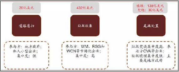 美国废物管理(WM.US)、共和废品处理(RSG.US)和Waste Connections(WCN.US)三大美国固废独角兽占据全美固废市场45%份额,体量最大的WM市值超过490亿美元。2005年至今,美国上市的龙头固废复合年涨幅在13-25%,大幅跑赢SP500指数,为股东提供了优异的回报。我们试图从三个视角出发:市场范围和发展阶段、商业模式和监管原则、竞争格局及成长路径,深入探究中美两国固废市场的异同,从而发觉美国固废龙头公司成长背后的秘密,以及对中国同行的未来发展路径提供的借鉴经营和分析依据。 美国固废龙头更像环卫企业,中国环卫市场化变革或重塑产业链 从市场范围、发展阶段看,美国固废行业最大市场是在垃圾“收集运输”环节,业态上类似运输车队,2015年市场价值约约432亿美元,市场化程度高,而美国在清扫环节(我们理解的环卫一部分)的市场规模则非常小。尾端“处置”环节,美国主要是采用填埋的处置方法,投资、技术含量低,市场规模也不大。