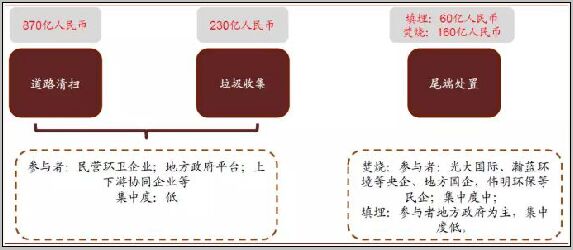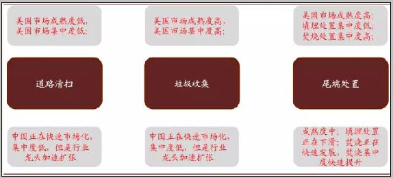 而中国最大市场在清扫和尾端处置,但是中国尾端处置公司一般不涉及收集中转运输环节。如果中国尾端处置的公司,希望像WM、RSG等美国同行一样获取“收集中转运输”环节利润,就必须涉及清扫业务,这是和美国公司业务范围根本的不同。中国清扫环节虽然同样是千亿级大市场,但其人员密集型的商业模式,与收集运输、尾端处置环节相对更资金密集、技术管理输出的商业模式有很大不同。因此,我们认为在中国固废市场不能简单复制美国固废市场的上下游延伸的发展逻辑。