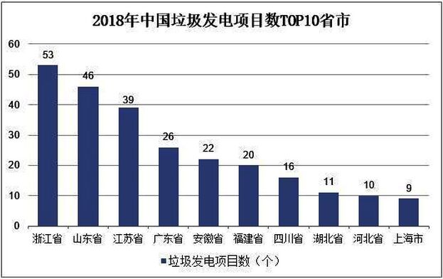 2018年中国垃圾发电项目数排名前十位的省市。资料来源:华经情报网