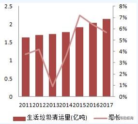 图表 1:2012-2017年全国生活垃圾清运量(亿吨,%)