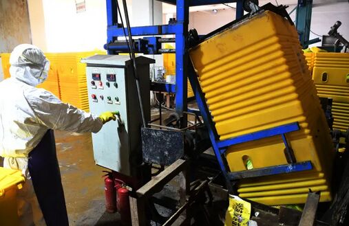 医废处置人员正在给医废周转箱消毒。