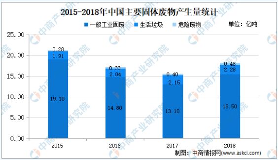 我国一般工业固废产生量最大 固体废物主要包括生活垃圾、工业固废、危险固体废物等三个大类。我国主要固体废弃物中,一般工业固体废弃物产生量最大。数据显示,2018年我国大中城市一般固体废物产生量为15.5亿吨,同比增长18.32%。