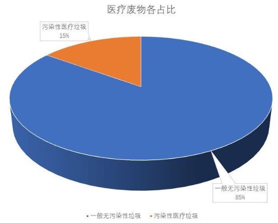 现代的医疗卫生体系的高标准是基于众多一次性塑料的医疗产品,如输液瓶(袋)、医用手套、防护衣、药纸杯、注射器、喷嘴、软管等,这些医用级的塑料产品在使用过一次后就丢弃,这样的处理方式大大降低了病毒的传播。所以,医疗机构每天都会产生大量的塑料垃圾。然而,目前世界各地的医疗机构都存在一个医用级塑料低回收率的问题,即一次性塑料的医疗产品通常没有进入系统性的回收过程,大部分是通过卫生填埋与焚烧直接处理。 据世界卫生组织统计,医疗活动中产生的废物总量,其中约85%的垃圾属于无害废弃物,只有15%的垃圾才是具有传染性、化学性或放射性的危险物质。大规模的统一焚烧和填埋医疗废物不符合我国实现废弃物减量化、资源化、无害化的初衷。