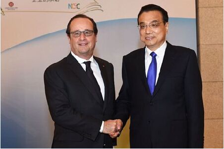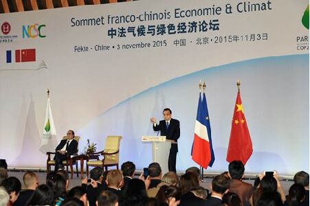 11月3日,国务院总理李克强在北京钓鱼台国宾馆与法国总统奥朗德共同出席中法气候与绿色经济论坛并分别致辞。