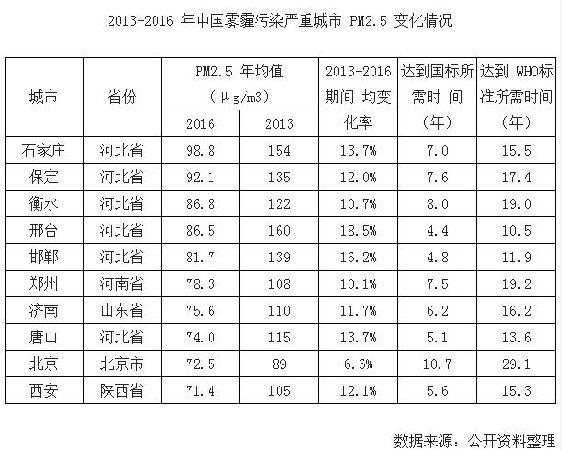 我国作为全球空气污染重灾区,近年来环境问题日益成为社会时刻关注的焦点。在 2016 年 EPI 报告中,中国空气 质量依然在 180 个参评国家中位列倒数第二,是世界上空气污染最严重的国家之一。近年来,我国空气质量有所改善, 2013-2016 年期间全国平均 PM2.5 指数从 72.2 下降至 49.9(μg/m3),年均下降率达 8.8%。从地区上看,京津冀及周边 城市在治霾上取得了一定的成绩,但依旧是雾霾爆表的高发区域(表 1),PM2.5 年均值直逼 100μg/m3,接近世卫组 织限值标准 10 倍。以近四年的下降速度计算,这些城市空气质量达到国标仍需要 7-8 年时间,达到 WHO 标准所需时 间更是长达 17 年左右之久。可以看出,我国近年空气质量有了一定改善,但程度上远远不够,多地仍会不时出现雾霾 爆表的情况,媒体、民众对环境重视程度更是‚水涨船高。因此,中国在‚治霾大业上还有很长一段艰难的路要走, 亟需政府继续坚定大力解决环境污染的决心,能源结构转型迫在眉睫。